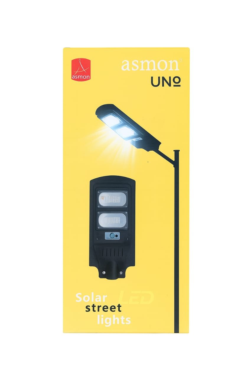 Illuminate outdoor spaces efficiently with the ASMON LED Solar Street Light. Designed for durability and energy savings, this street light features a high-efficiency solar panel that charges during the day and powers bright LED lighting at night. The integrated motion sensor ensures optimal brightness when movement is detected, while the weatherproof construction guarantees reliable performance in all conditions. Ideal for streets, gardens, parking lots, and pathways, the ASMON street light offers hassle-free installation with no wiring required.
